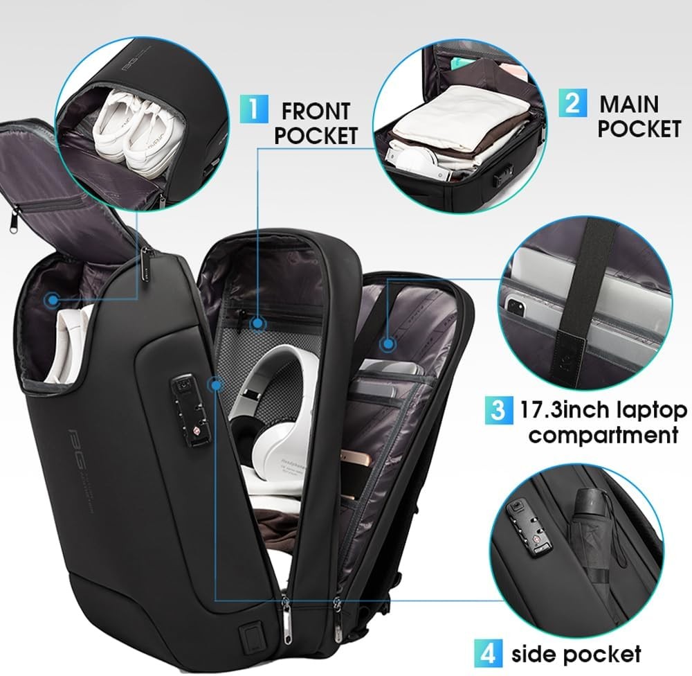 THREE POCKETS WITH MORE FUNCTIONS: Bange upgraded backpack has three separted pockets. The front one can fit one pair of shoes or other personal items, such as power bank, glasses, head set and so on. Per the middle pocket, there is a TSA lock, which can protect your valueable item. The separated laptop compartment can hold one 17.3 inch notebook, and our friendly design can be shockproof and waterproof. It's your best partner during business trip.