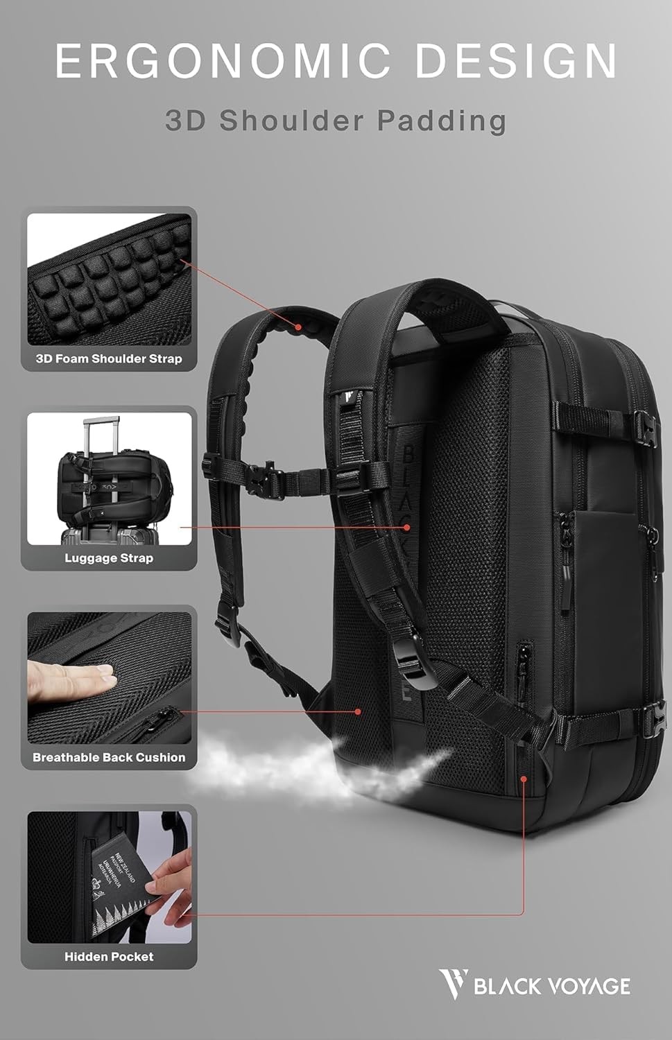 • 【Multiple Compartments and Pockets】Designed for versatility, the Black Voyage backpack includes multiple compartments such as a wet/dry separation layer, water bottle pocket, power bank pocket, thermal bag, anti-theft pocket, padded compartments for tablets and 19" laptops, a multi-functional organizer, and the integrated vacuum bag. It's built to hold all the essentials for your journey.