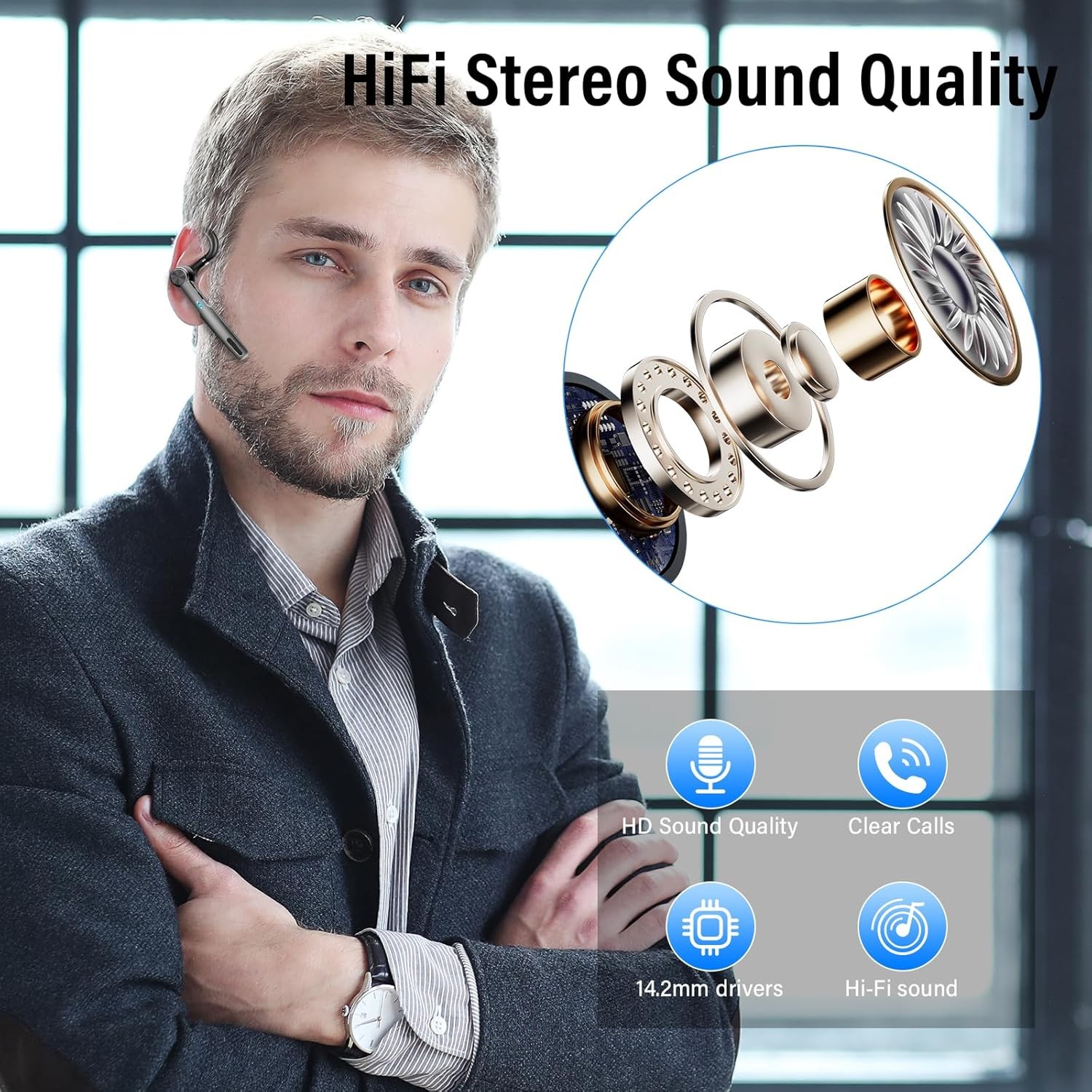 [ENC & CVC8.0 Clear Calls] - This dual-mic designed bluetooth earpiece applies ENC and CVC8.0 noise reduction tech, well reduces external distractions and optimizes sound clarity for both the callers and listeners.