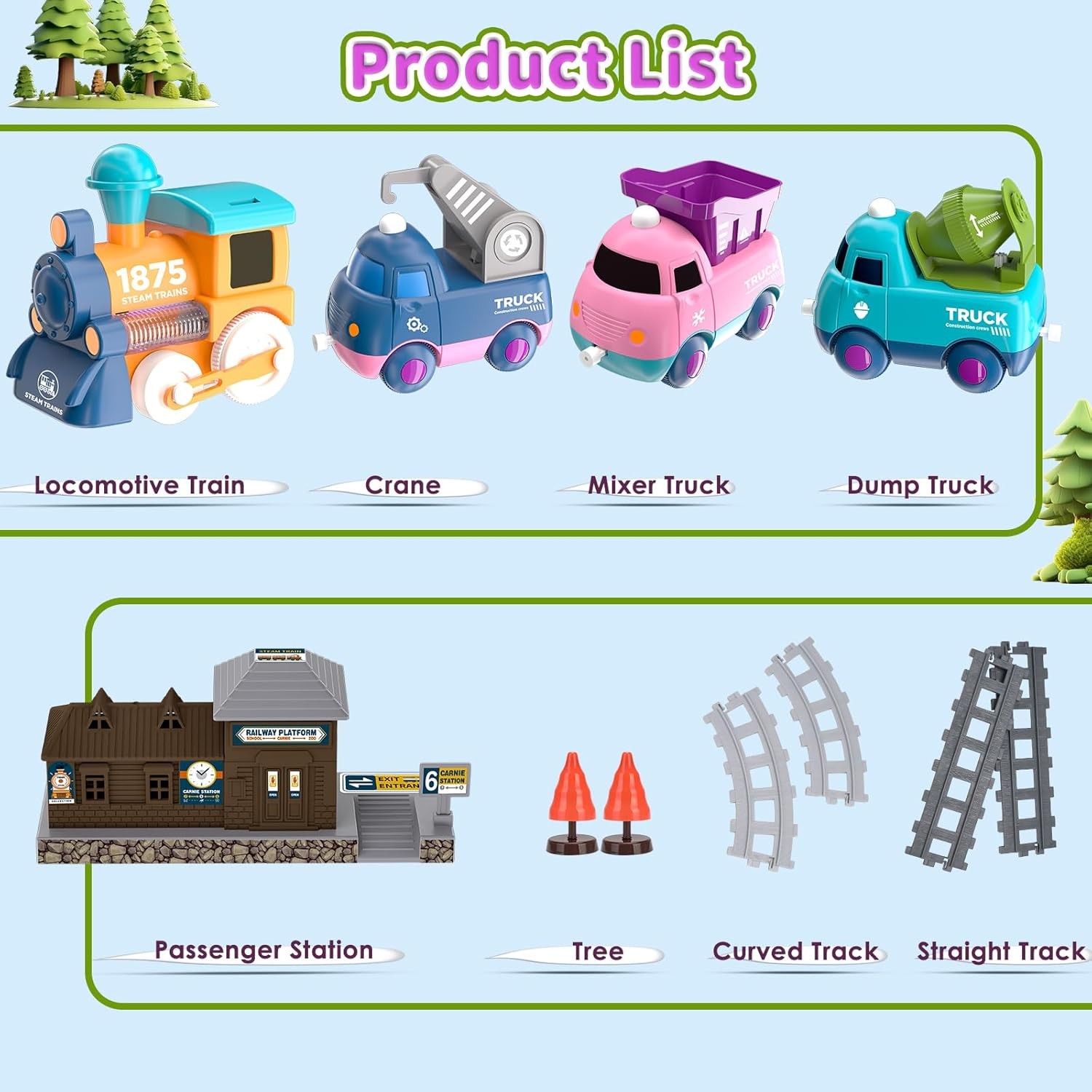 • TODDLER TRAIN SET: Includes 1 light-up Locomotive with sounds, 1 locomotive train, 1 crane, 1 mixer truck, 1 dump truck, 1 passenger station, 2 trees, 8 curved rails and 2 straight tracks (form a oval Tracks ), This train set for toddlers easy assembly, the train toy encourages kids to build their own track layouts, make independent decisions and solve problems independently. The variety of combinations helps spark creativity and enhance focus