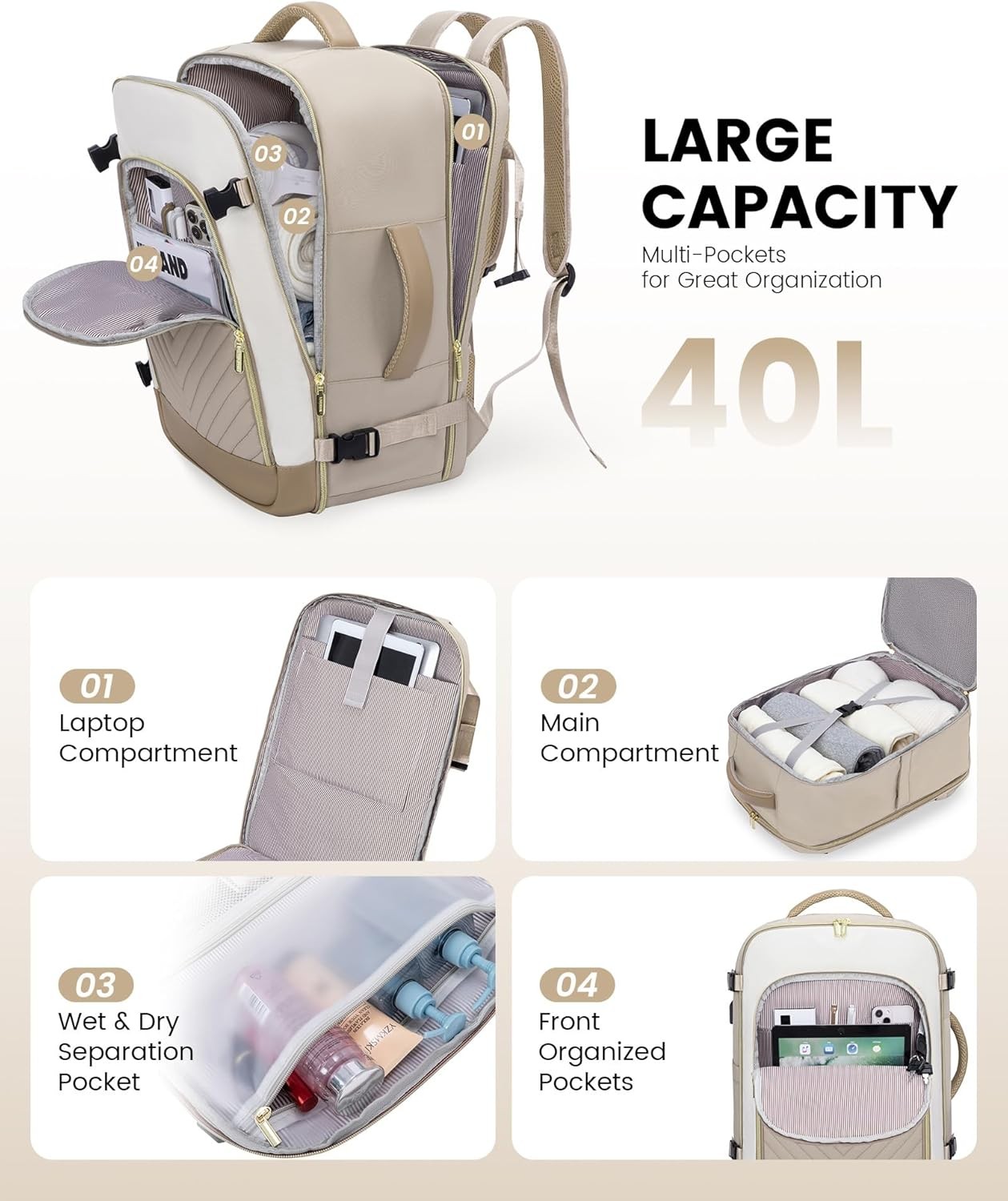 • Large Capacity & Well Organized】40L capacity, 4 main compartments, and 15 pockets, designed to allow you to easily separate and organize your travel personal items, roomy space can even fit in 3-7 days of travel essentials.