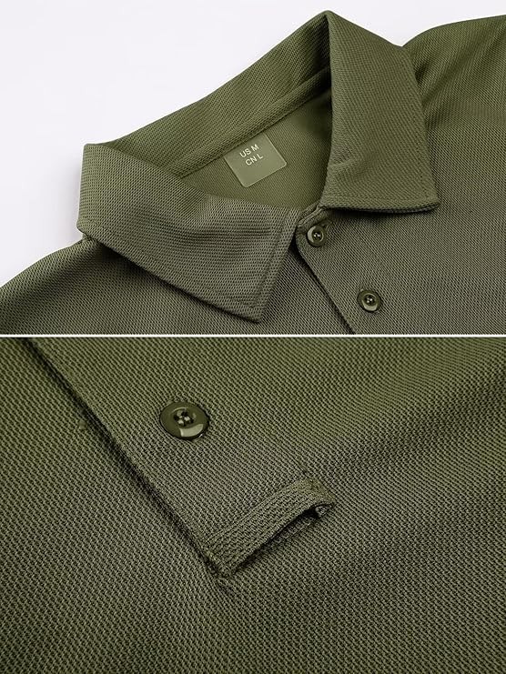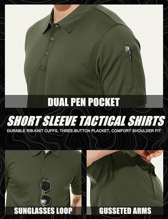 Style: Classic polo shirts with 3-button placket and spread collar, a loop under the buttons suitable for hanging sunglasses or microphone, dual pen pockets on left sleeve for your convenience